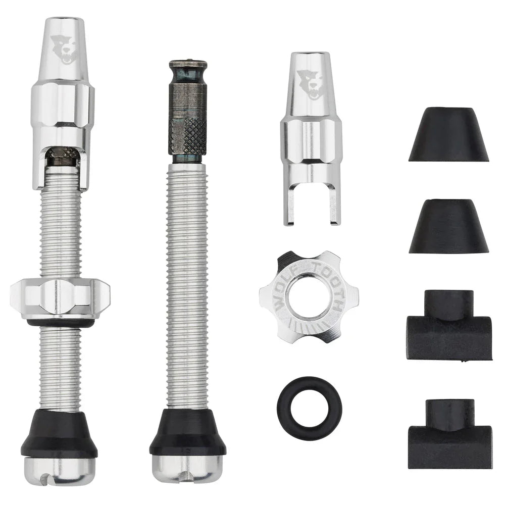 Tubeless Valve Stems for Clik Valve are compatible with tubeless rims that are drilled for Presta valves. They are available in 44 and 60 mm lengths, and in nine colors to match other Wolf Tooth anodized components. Just like the existing Tubeless Valve Stems for Presta, the new option for Schwalbe Clik Valve includes an oversized nut for easy grip, integrated valve core wrench, and two extra rubber bases.