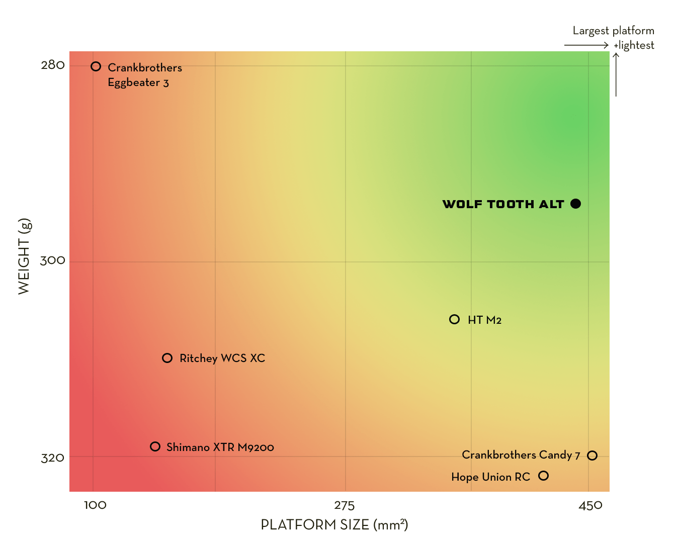 - Larger platform area than the competition at 345 mm² (compared to Shimano XTR 9200 at 144 mm², Hope RC at 420 mm², and HT M2 at 357 mm²)