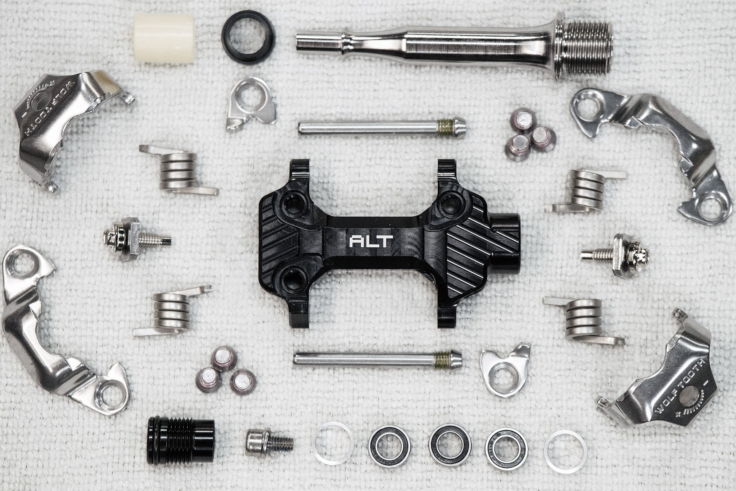 The ALT XC Clipless Pedals have an adjustable Q factor in 4 mm increments. Inside the pedal is a stainless steel axle, three bearings, and two spacers. The spacers and bearings can be rearranged for Q factors of 51, 55, or 59 mm. This is simple enough for anyone to do at home. A spacer kit including 4x 2mm spacers is available for purchase to further fine tune Q Factor adjustment. Like most Wolf Tooth components and accessories, replacement parts and service guides are available via Wolf Tooth Right to Repair.
