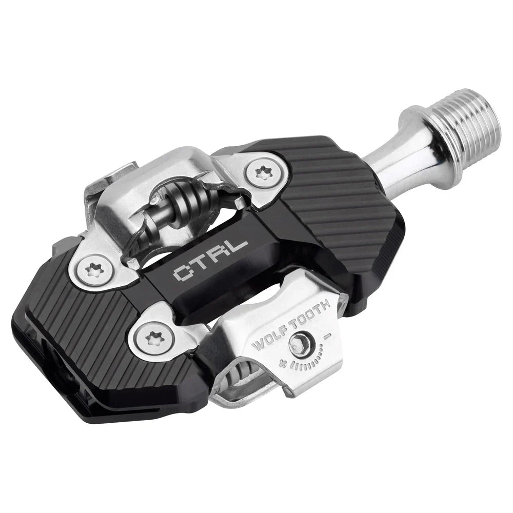 Wolf Tooth CTRL Trail Clipless Pedals are designed for unparalleled control and support for all-mountain riding with flawless clip-in/out performance. No other SPD-compatible trail pedal has a large platform (941 mm²) that contacts the shoe and locks in the shoe like this. CTRL Trail Clipless Pedals are simultaneously lighter (326 g) and thinner (15 mm) than all other trail mountain bike pedals with an exceptionally low stack height. The thin profile means better cornering clearance, while the open center between the binding cages increases mud shedding ability.