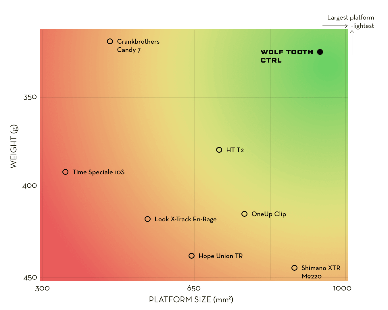 - Bigger platform area than the competition at 941 mm² (compared to Shimano XTR 9220 at 883 mm² and Hope Trail at 645 mm²)