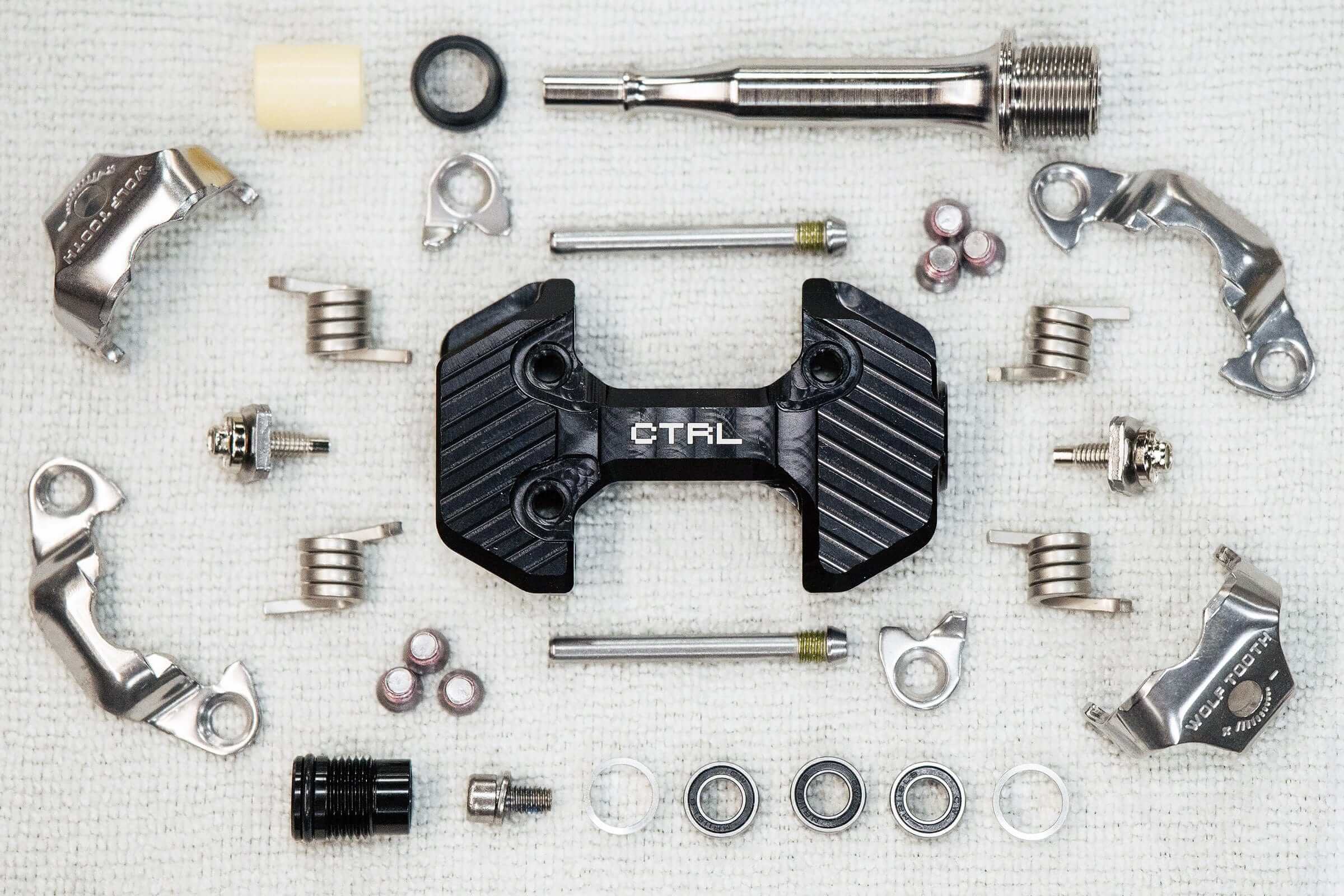 The CTRL Trail Clipless Pedals have adjustable Q factor in 4 mm increments. Inside the pedal is a stainless steel axle, three bearings, and two spacers. Spacers and bearings can be rearranged for Q factors of 51, 55, or 59 mm. This is simple enough for anyone to do at home. A spacer kit including 4x 2mm spacers is available for purchase to further fine tune Q factor adjustment. Like most Wolf Tooth components and accessories, replacement parts and service guides are available via Wolf Tooth Right to Repair.