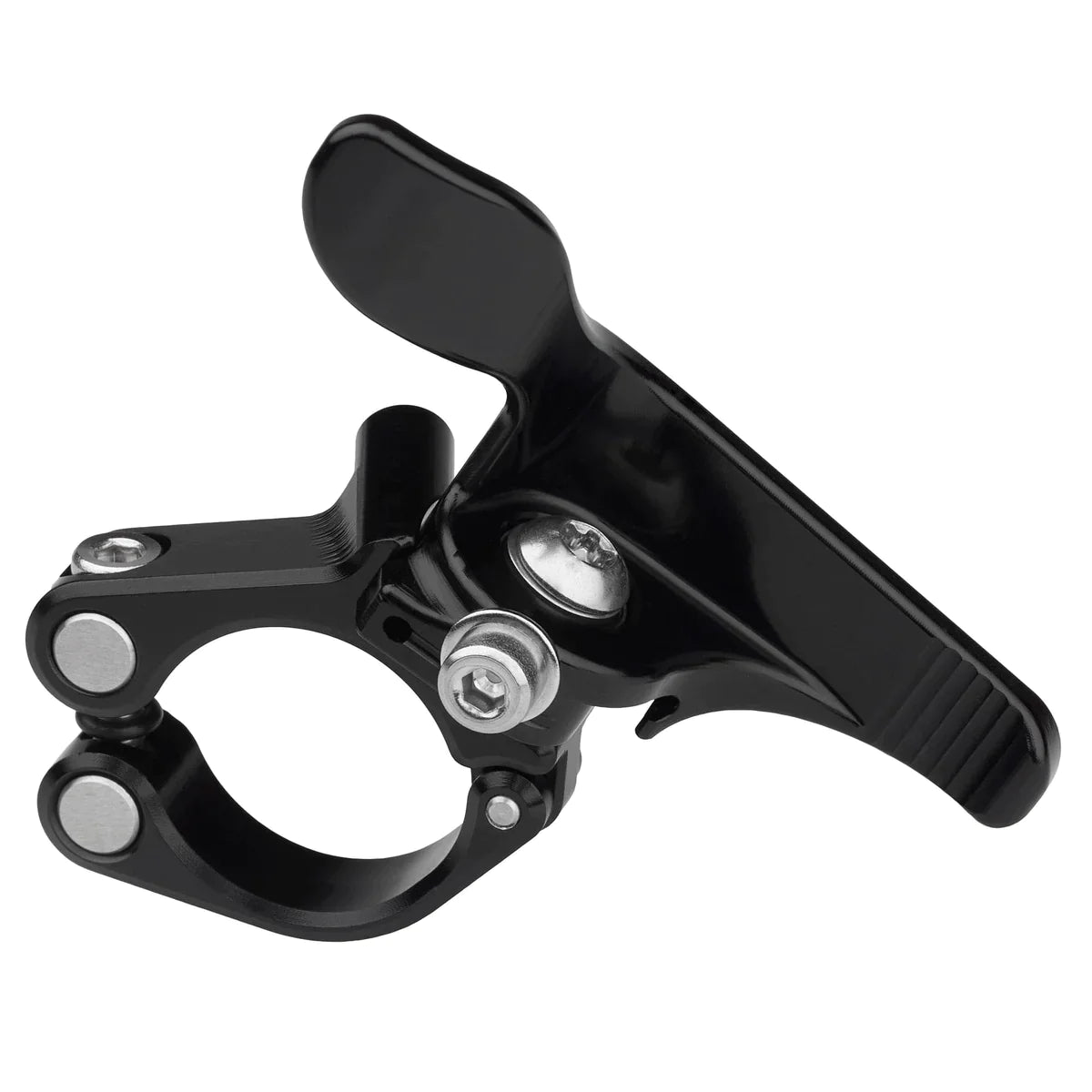The machined clamp is on the opposite side of the assembly from the bearings and lever, which allows the base to be closer to the bars. This creates an assembly with a lower profile and natural ergonomics compared to competitor levers. A clamp opposite of the lever on the assembly also means that the clamp does not interfere with hand placement. A clever pocket was machined into the lever itself. This is where the cable end can be tucked away, hidden from sight and out of reach.